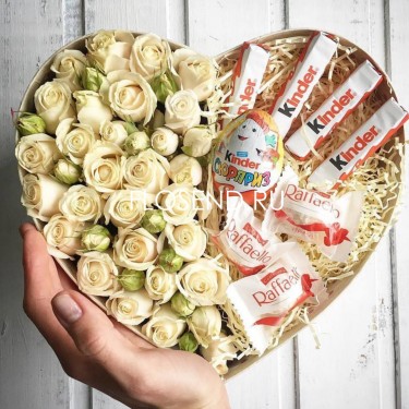 Коробка форме сердце «Розы кустовые белые и сладости»