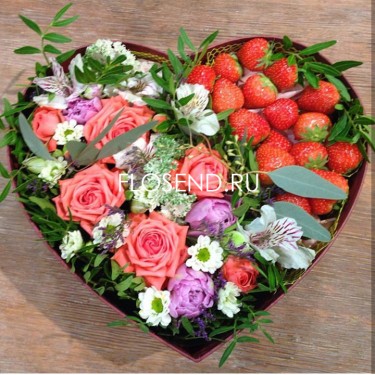 Цветы и клубника в коробке сердце