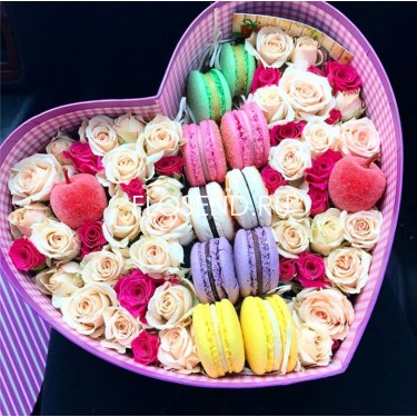 Розы кустовые, декор и макаронс в коробке